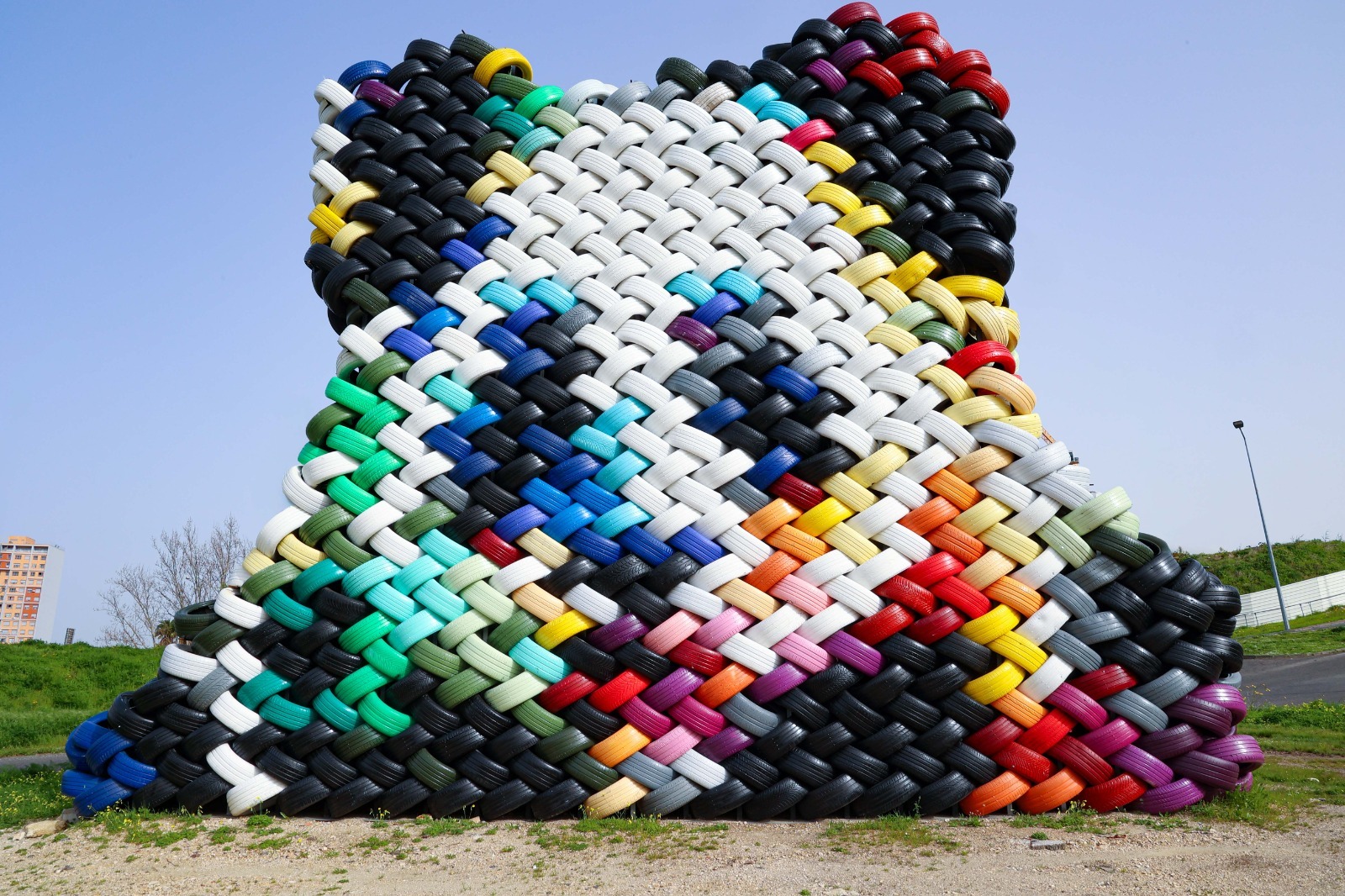 Produzida com centenas de pneus usados fornecidos por Centros da Rede de Recolha da Valorpneu, a instalação reflete sobre o reaproveitamento de materiais em fim de vida e a urgência de repensar os impactos dos mesmos na sociedade.